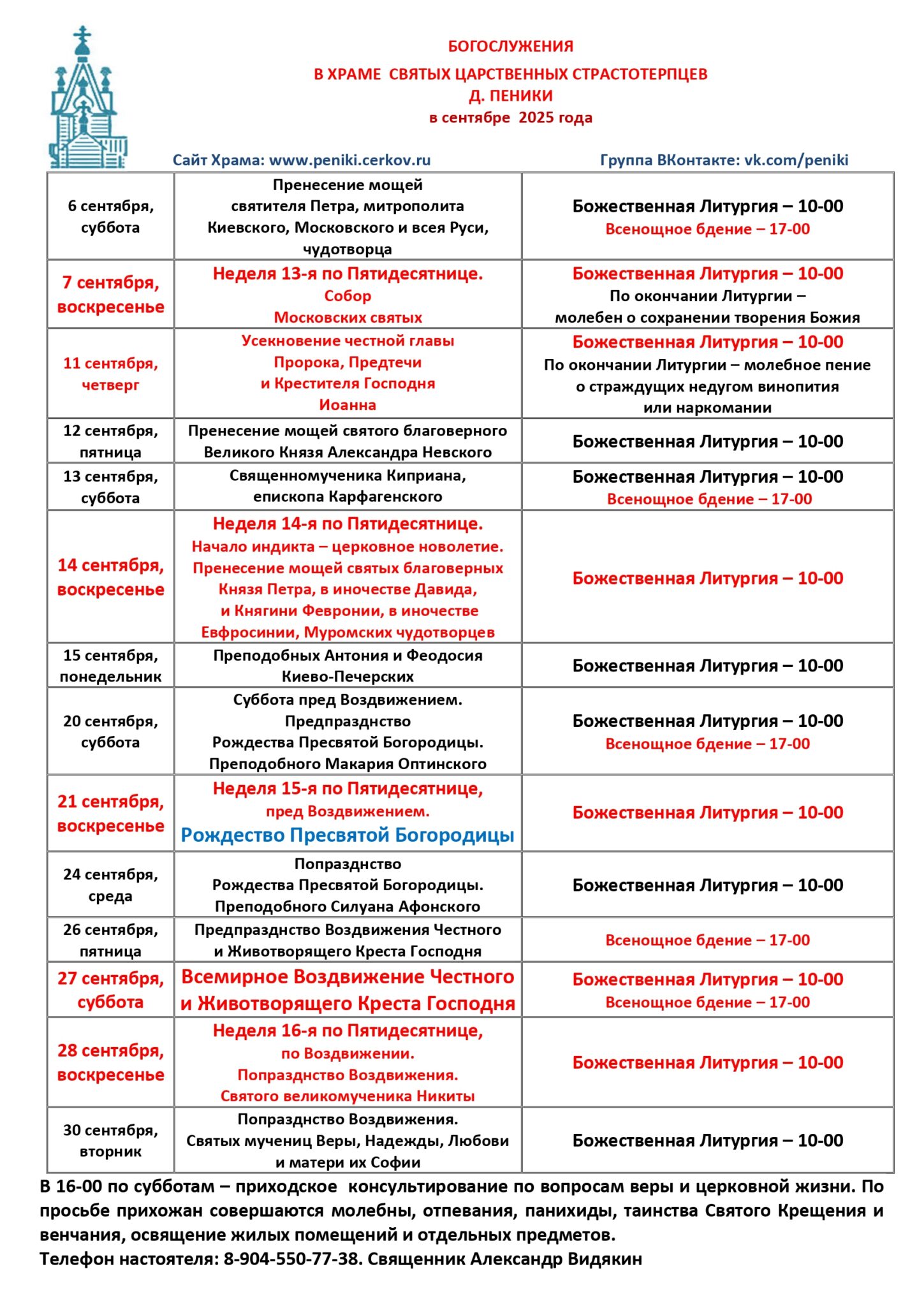 Расписание богослужений на сентябрь 2025 года в храме св. Царственных Страстотерпцев д. Пеники Опубликовано 31.08.2025 konstsazhin Рассказать о нас друзьям:Поделитесь в Twitter (Opens in new window)Отправить ссылку в ВКонтакте (Opens in new window)Отправить ссылку в Одноклассники (Opens in new window)Click to share on Google+ (Opens in new window)Отправить ссылку в Мой Мир (Opens in new window)
